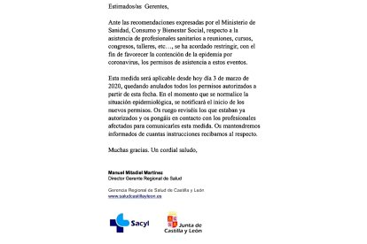 El Gerente Regional de Salud, Manuel Mitadiel Martínez , ante “las recomendaciones expresadas por el Ministerio de Sanidad, Consumo y Bienestar Social” , ha enviado una circular a los gerentes en la que manifiesta que “se ha acordado restringir los permisos de asistencia” a los profesionales sanitarios “a reuniones, cursos, congresos o talleres” con el objetivo “de favorecer la contención de la epidemia por coronavirus".