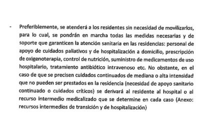 El documento alivia las restricciones conjuntas dictadas en marzo y actualizadas en abril por las gerencias de Salud y Servicios Sociales. Si entonces la pauta era «preferiblemente atender a los residentes sin necesidad de movilizarlos, ahora Sanidad se limita a señalar que «en muchas ocasiones el tratamiento se podrá dispensar en la propia residencia, garantizando la mayor calidad posible» mientras que «otras veces habrá que derivar a hospitales y recursos de cuidados intermedios según el estado clínico y situación del paciente» . En otro documento de la Consejería de Sanidad, fechado también el 6 de julio y que regula el procedimiento de diagnóstico y control en las residencias de mayores durante la nueva normalidad, insiste en esa misma pauta:«siempre que el residente precise de medidas terapéuticas que no se puedan llevar a cabo en la residencia», los médicos de referencia y de urgencias «considerarán su remisión al hospital».