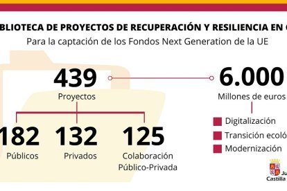 "Hemos recopilado ya 439 proyectos para captar los nuevos fondos de la UE e impulsar la recuperación y modernización de #CYL . Suman más de 6.000 M€. Gracias a todas las empresas, instituciones y entidades que estáis contribuyendo a diseñar un futuro mejor para nuestra tierra", ha indicado el presidente autonómico a través de la red social, acompañado de un gráfico.